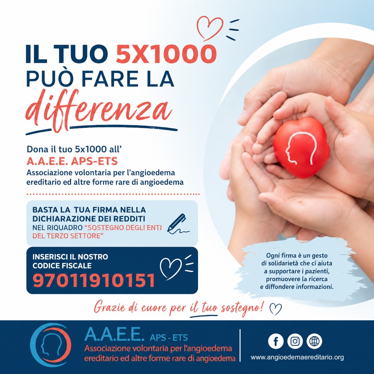Il tuo 5×1000 non ti costa nulla, ma per chi vive con l’angioedema può significare supporto concreto, ricerca e informazione.